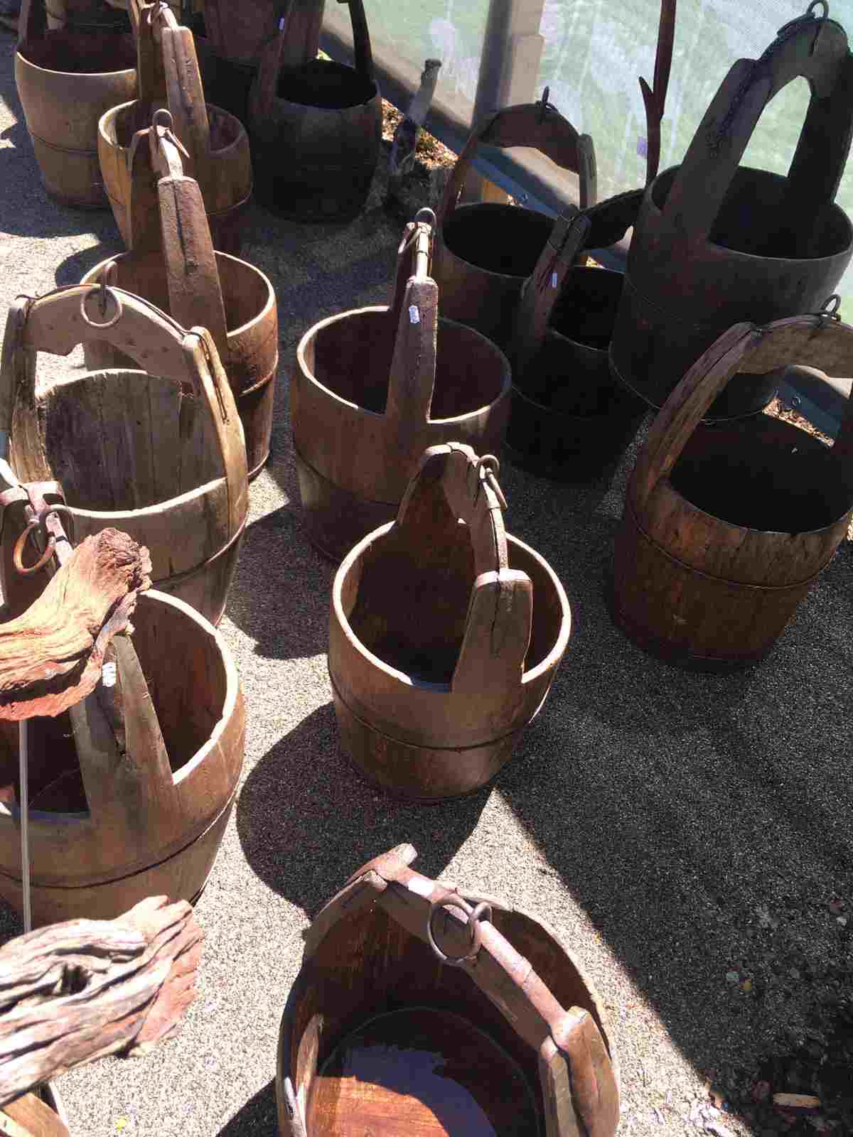 Das Foto zeigt historische Milcheimer von einem Verkaufstand..